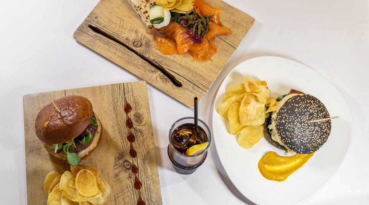 Pane morbido ,salsiccia nostrana alla griglia,burger di vitellone marchigiano, guanciale croccante, pecorino semi stagionato, misticanza, maio senape e paccasassi