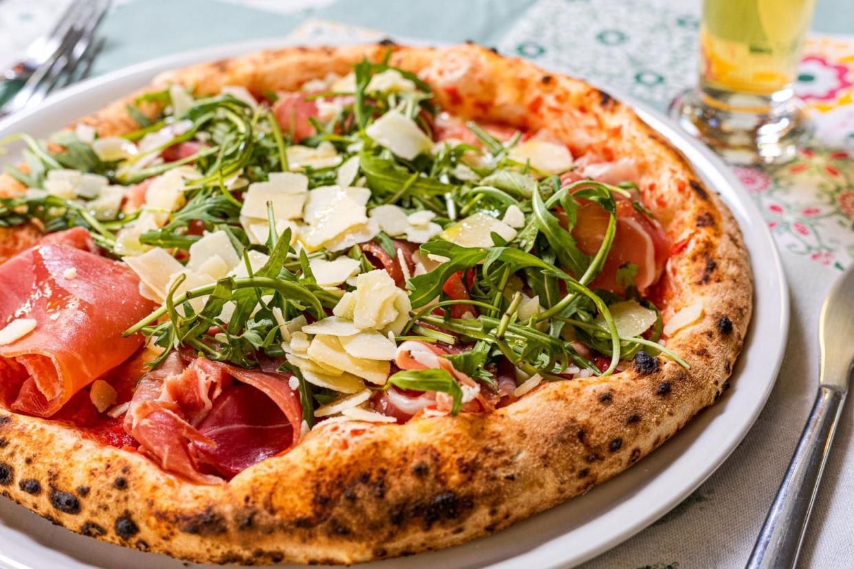 Pomodoro, fior di latte, funghi, carciofi cotti alla brace, cotto arrosto in uscita, polvere di olive nere, basilico, olio evo