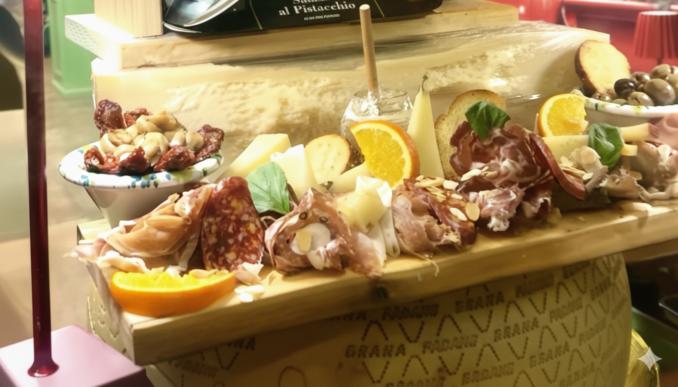 Tagliere con Caponata, olive siciliane, panelle e crocchè, burrata e crema di pistacchio, selezone di Salumi Siciliani, e formaggi tipici