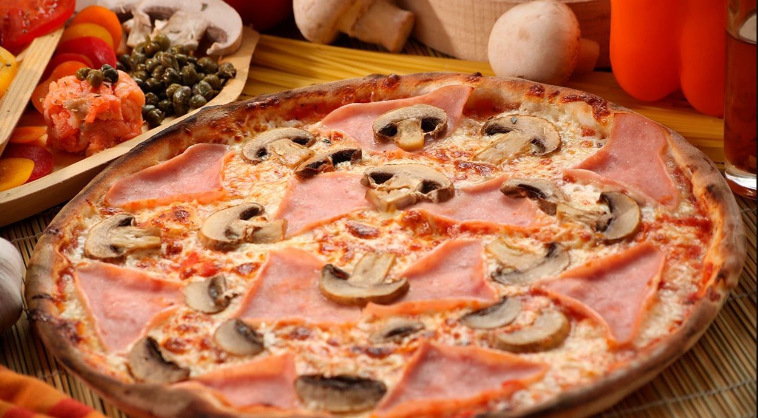 Pomodoro San Marzano DOP mozzarella fiordilatte, basilico, olio extravergine d'oliva, prosciutto cotto e funghi champignon