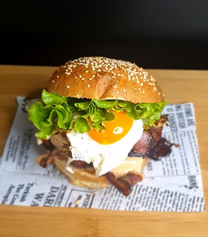 Burger bun inglese di nostra produzione, hamburger di carne italiana da 200 g, uovo occhio di bue, bacon, cheddar 9 mesi, insalata, cetriolo e salsa 100% gusto