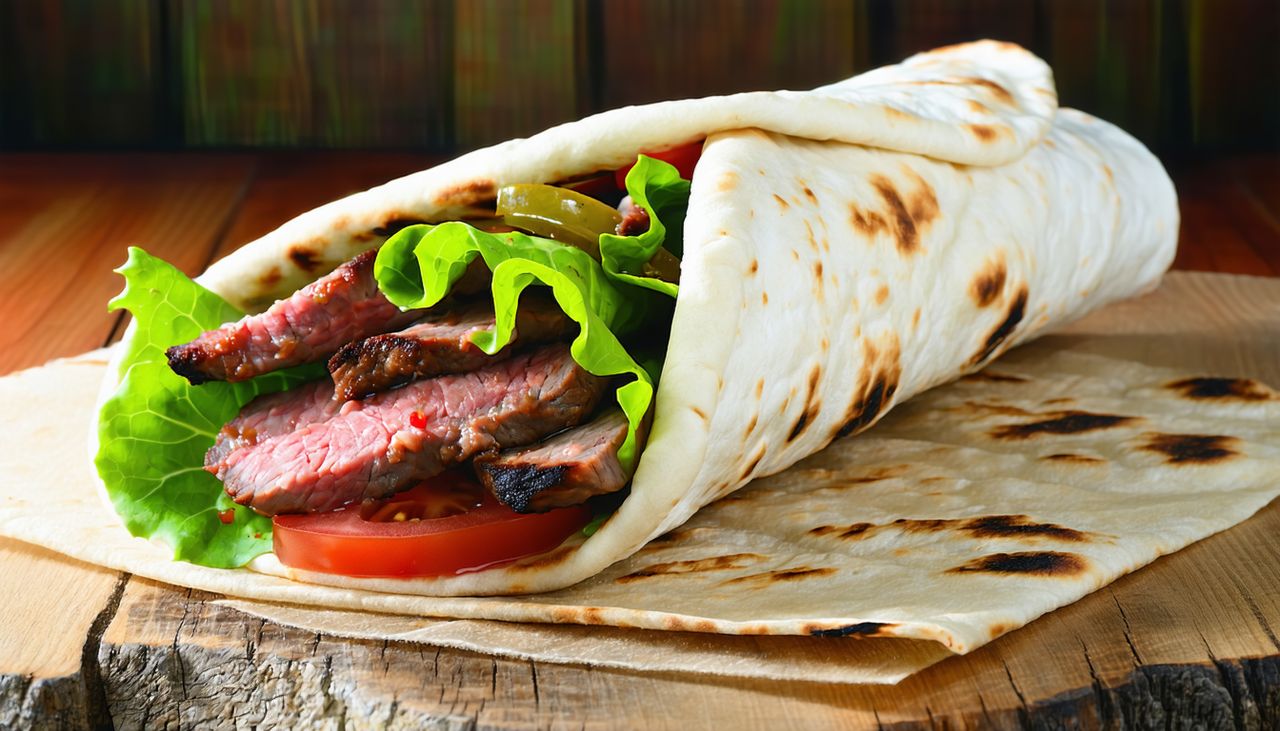 Хрустящий лаваш, золотистый картофельный пай, свежие овощи: помидор и огурец, куриное филе, приготовленное на углях, и неповторимый фирменный соус.