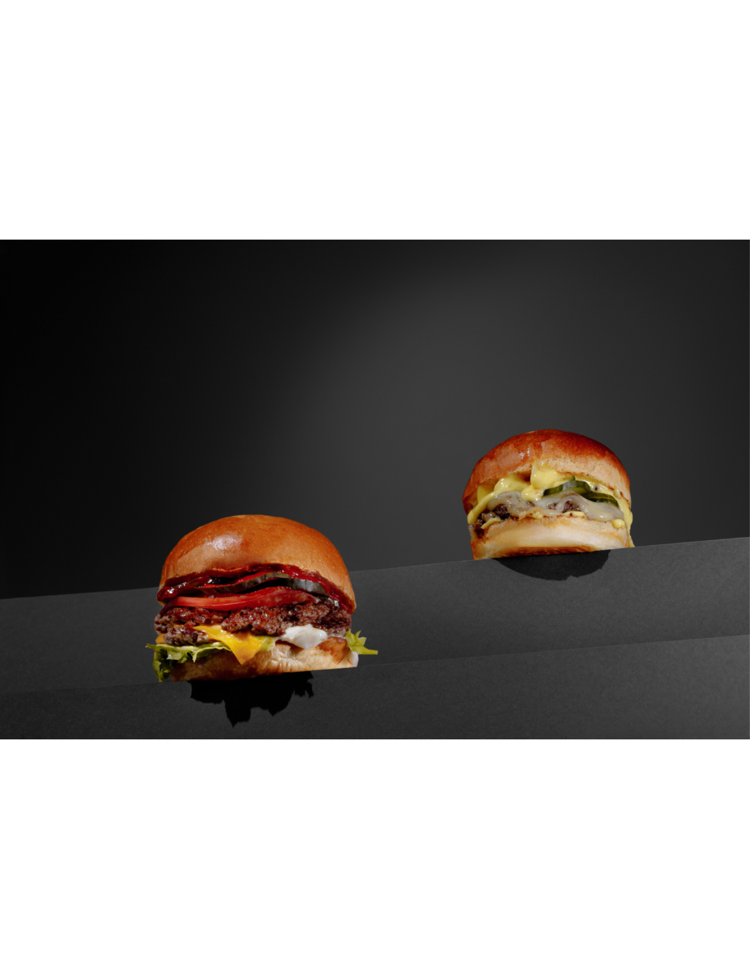 Двойная смаш котлета из мраморной говядины, соус для бургера, сладкие огурцы, сыр чеддер,говяжий бекон, помидоры, хрустящий лук