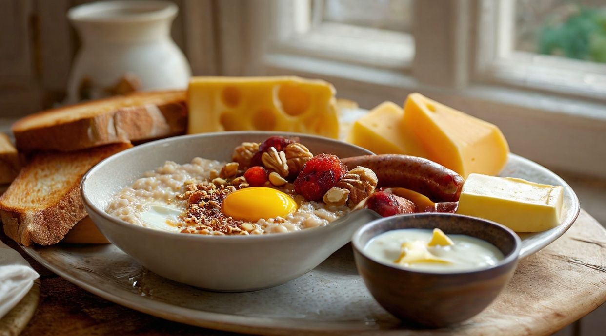 Каша на выбор,яйцо отварное, сосиски жар/вар, ломтики сыра, тост с маслом, йогурт