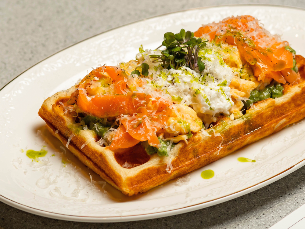 Теплая и сытная венская вафля с лососем домашнего посола, нежным кремовым гуакамоле, сытным скрэмблом, сливочной страчателлой и ароматными пармезаном и зеленым маслом