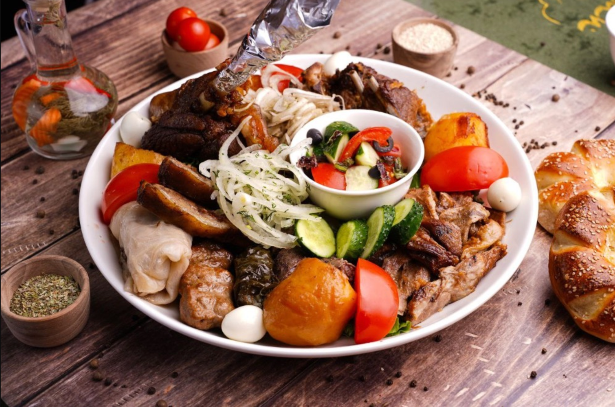 Жареная картошка, говяжье мясо, долма, хасип, шашлык из фарша, голубцы, лук