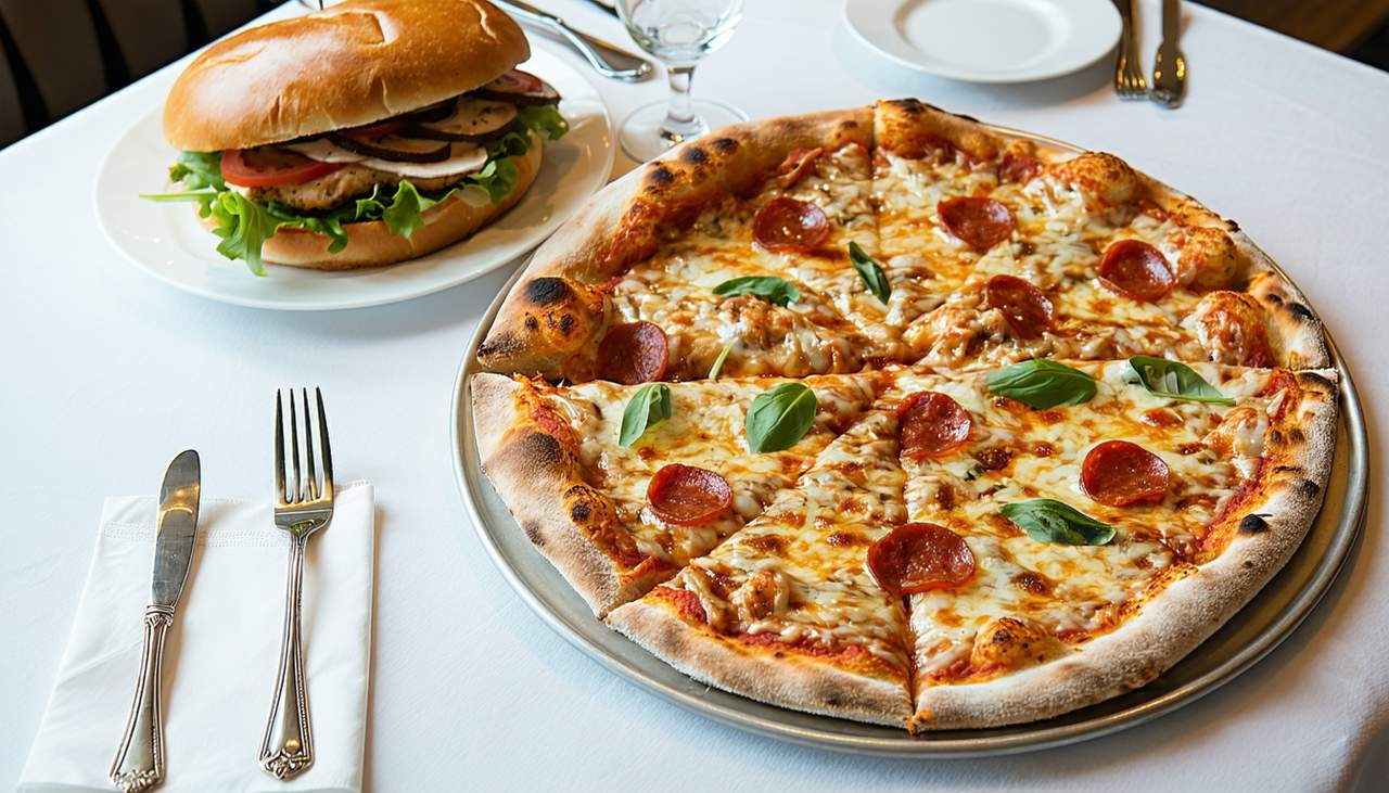 Sauce tomate, mozzarella, poulet, viande hachée, fruits de mer, thon, oignons, olives noires