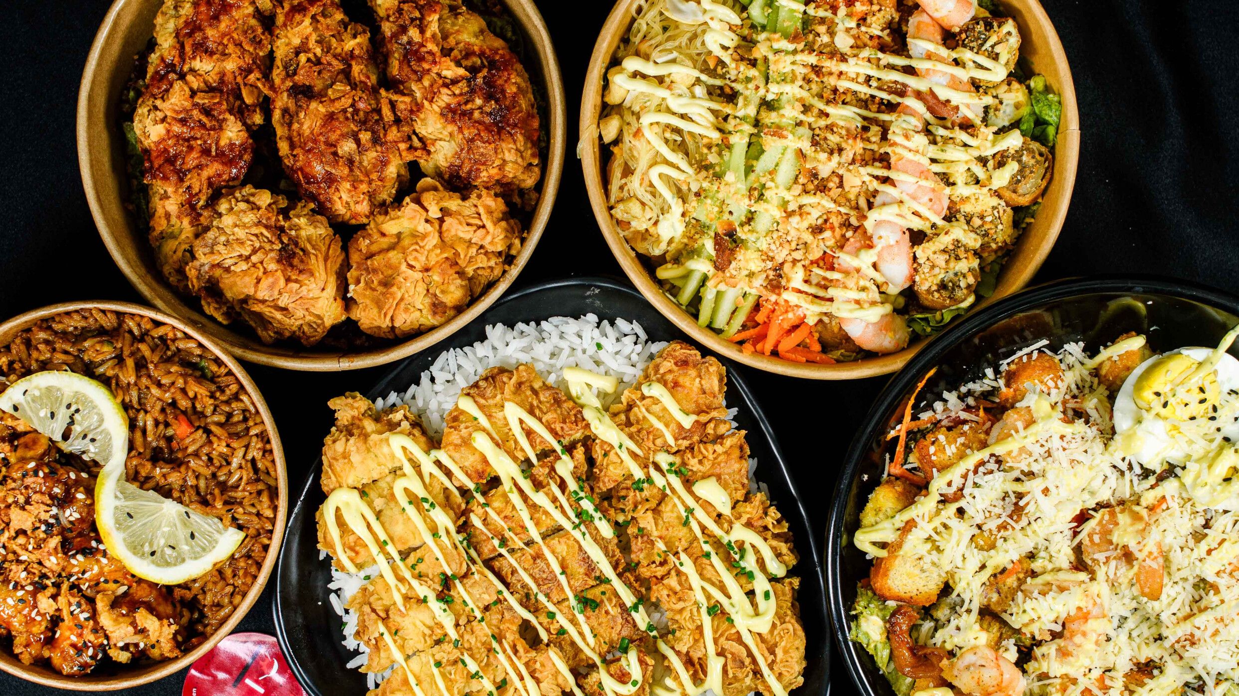 2x bowls au choix (Korean barbecue, chicken teriyaki ou sweet chili thaï) + 8x cuisses de poulet + une boisson offerte