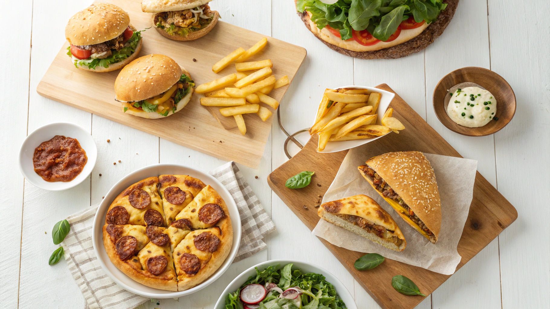 Chicken & Ground Beef baguette with salad and fries.