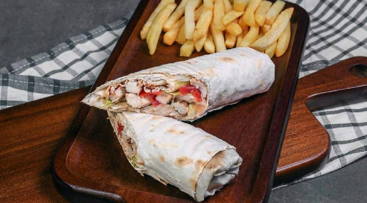 Tortila, carne pui, cartofi pai, cascaval, sos usturoi - 270g