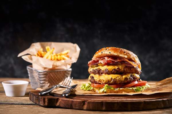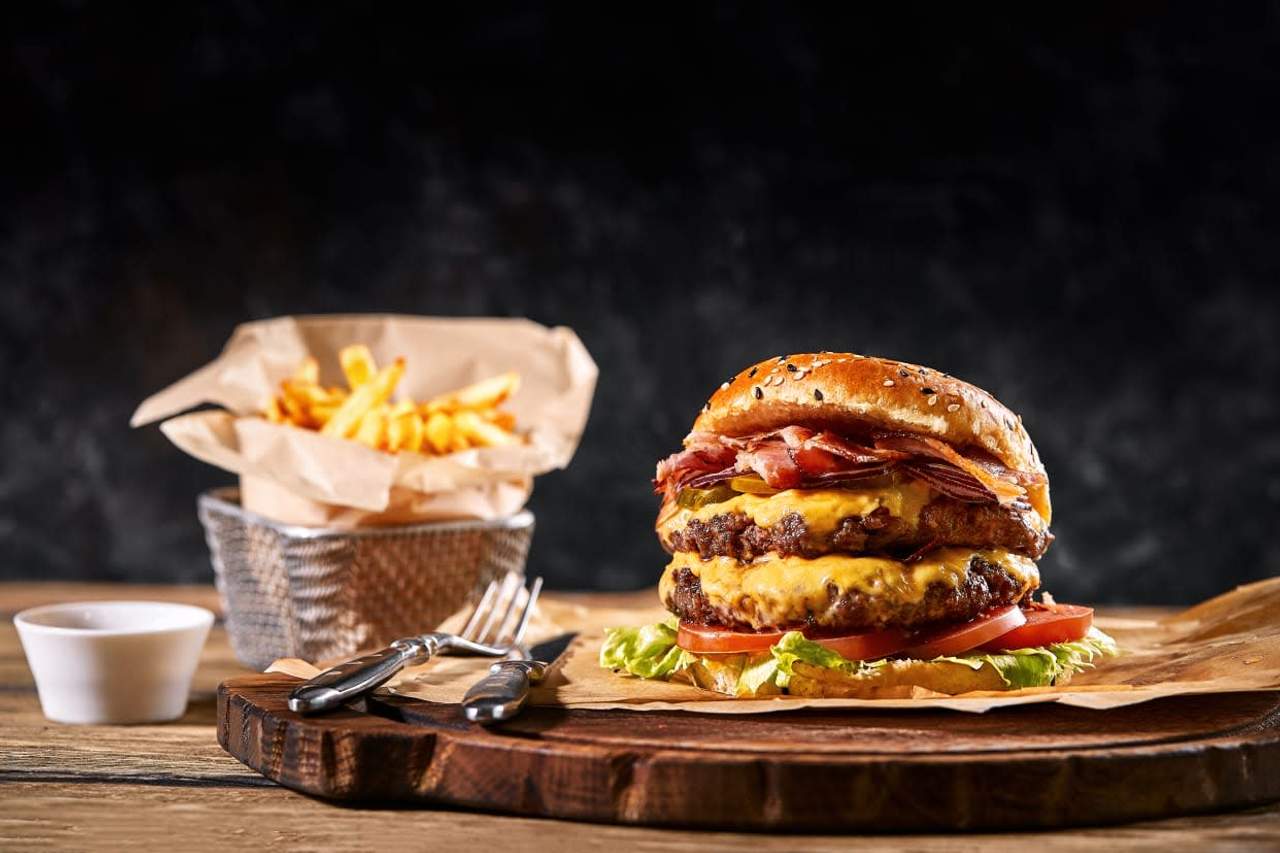 Duplo juneće meso, topljeni cheddar, burger sos, paradajz, kiseli krastavac, zelena salata