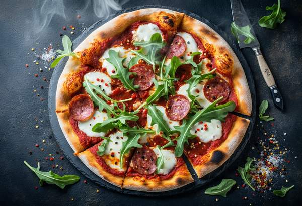 Tomato sauce, cheese, spacy salami, chilli peppers