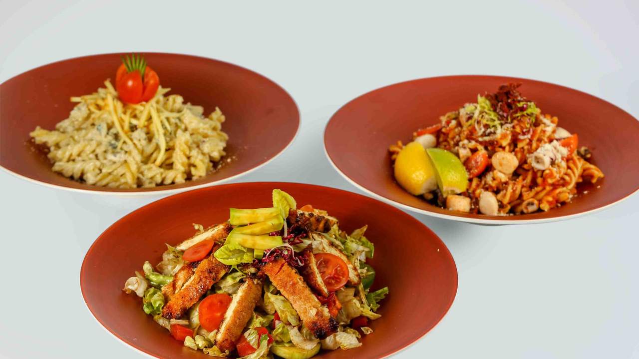 Tunjevina, zelena salata, paprika, crveni luk, masline, penne