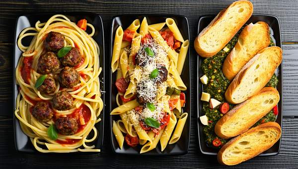 Penne, panceta, šunka, devičansko maslinovo ulje, jaja, beli luk, čeri paradajz, bosiljak, parmezan