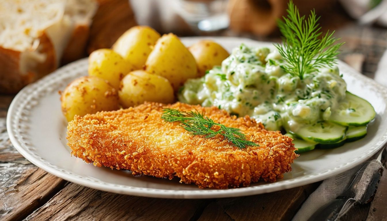 Schab po wiedeńsku (z jajkiem ok 100g), ziemniaki, surówka