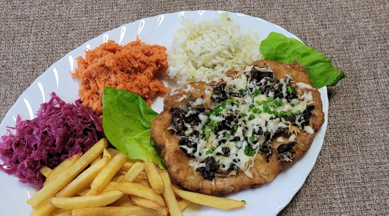 ser+ pieczarka, ziemniaki,lub frytki,zestaw surówek lub kapusta zasmażana