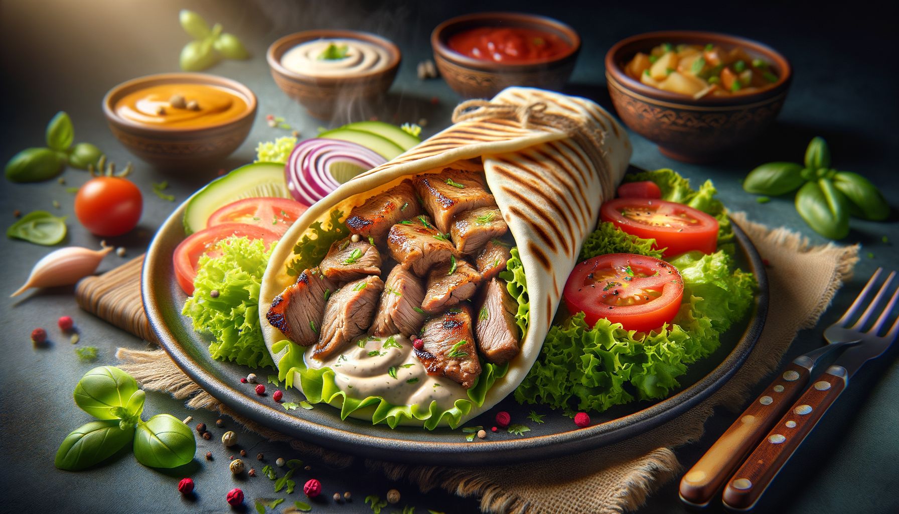 Z mięsem, sałatkami i sosem