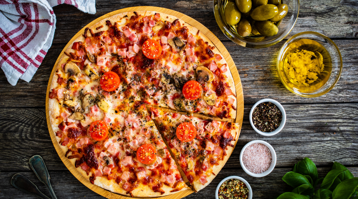 Sos marinara, mozzarella fior di latte, szynka, pieczarki, cebulka czerwona