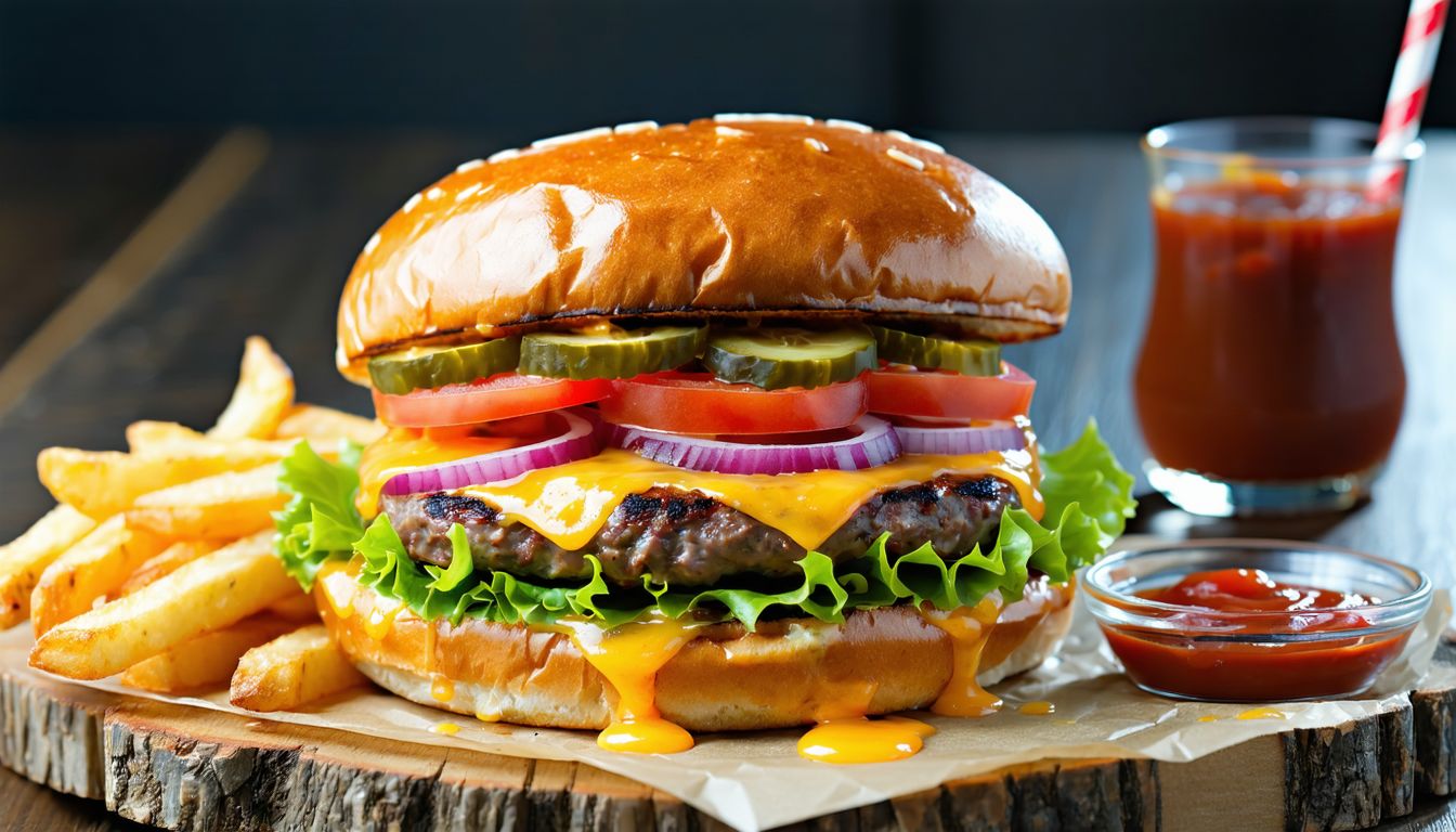 bułka naszego wypieku, bekon, 2x wołowina 100%, ser cheddar, mix sałat, pomidor, czerwona cebula, ogórek konserwowy, chutney z czerwonej cebuli, pomidor, krązki cebulowe, dip dijonez (cena zawiera opakowanie)
