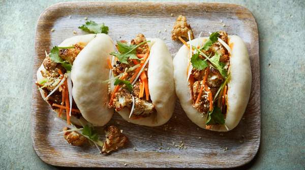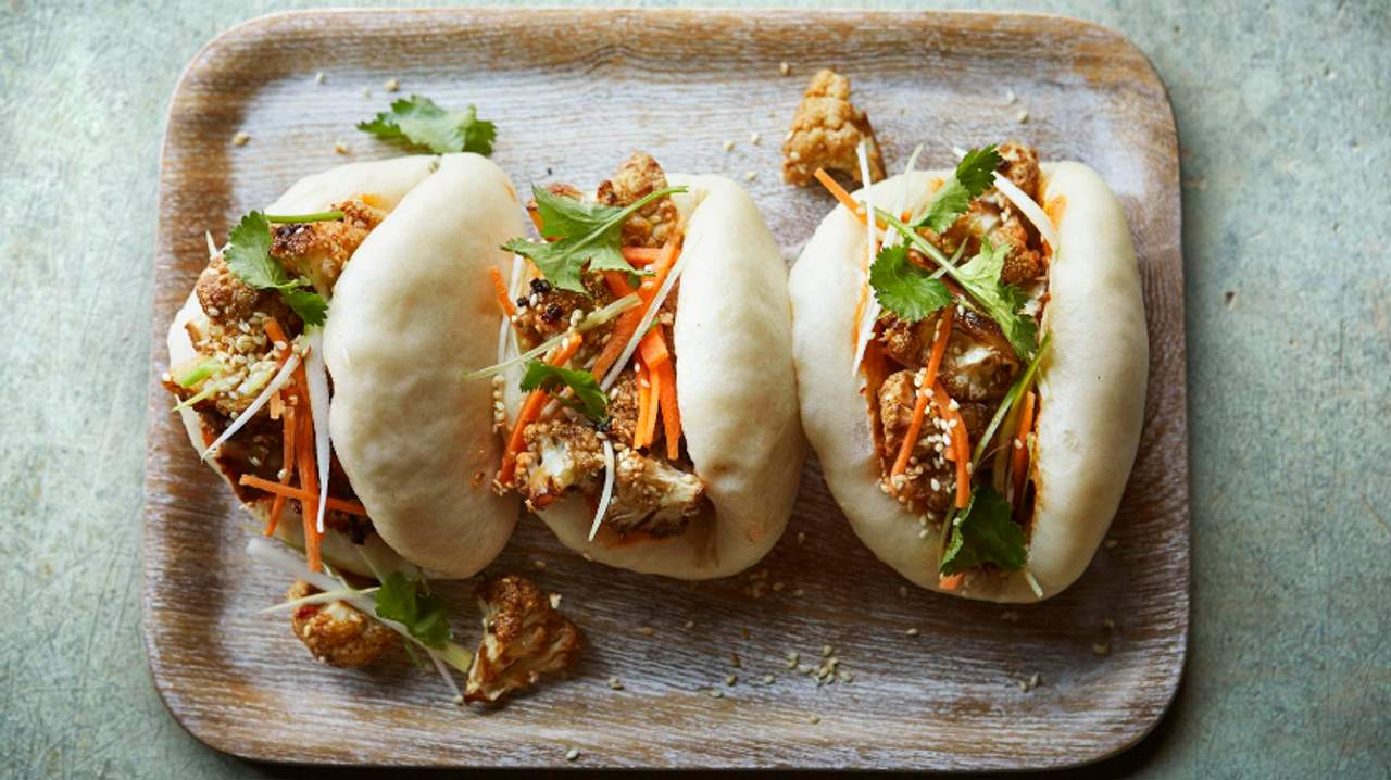 Dwie bułeczki bao z szarpaną wołowiną marynowaną w czerwonym winie z miodem, chrupiącymi piklami świeżą czerwoną kapustą, sałatą oraz sosem spicy mayo, podawane z frytkami *zdjęcie poglądowe