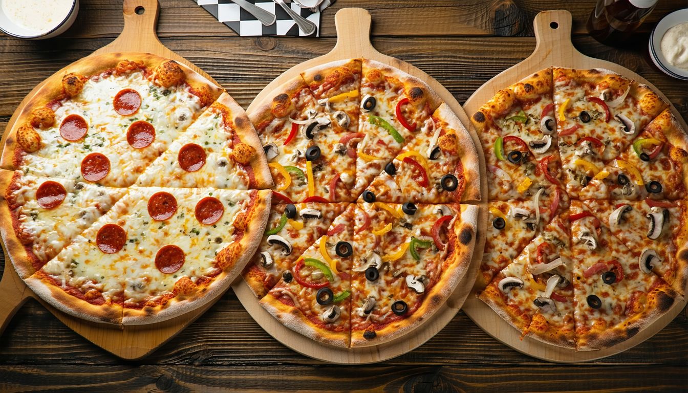 Sos pomidorowy, ser mozzarella fior di latte, szynka, bekon, salami, kabanos, cebula, pieczarki