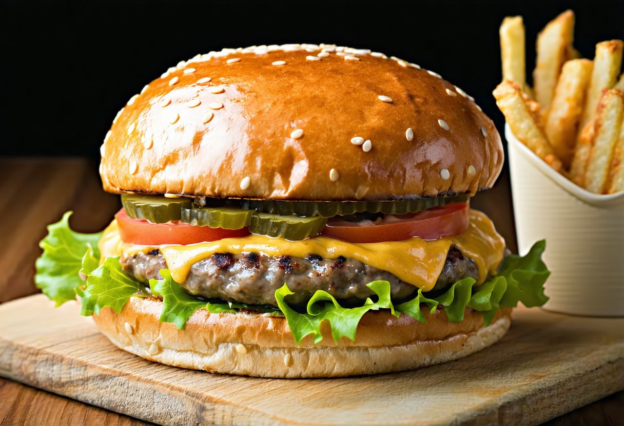 Wołowina, bułka, ser cheddar, sałata, pomidor, pikle, cebula czerwona, domowy ketchup, sos czosnkowy