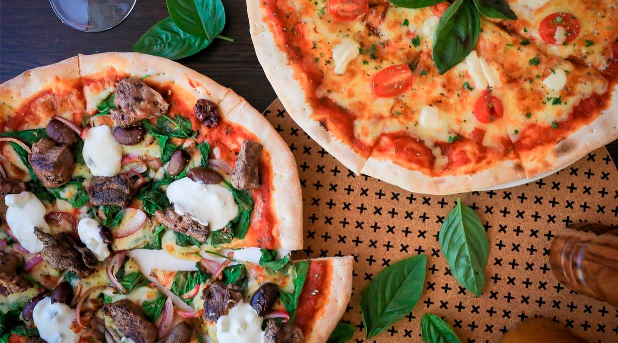 Ciasto chlebowe, sos pomidorowy, ser, boczek, ser wędzony z gór, bazylia