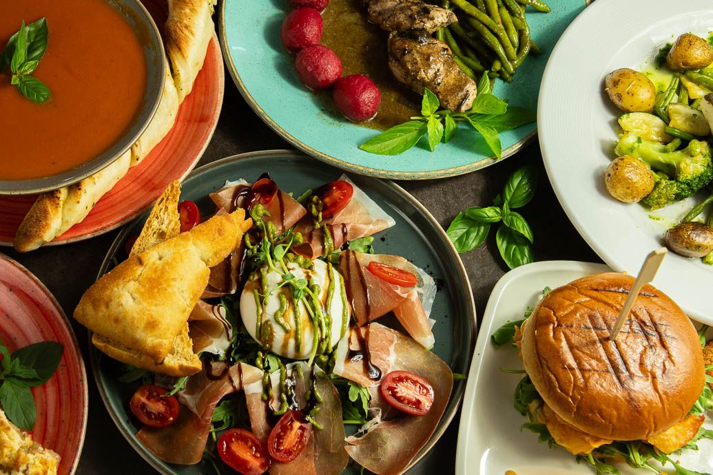 Burrata, rukola, szynka włoska, pomidorki koktajlowe, pesto bazyliowe, ocet balsamiczny, pieczywo schiacciata
