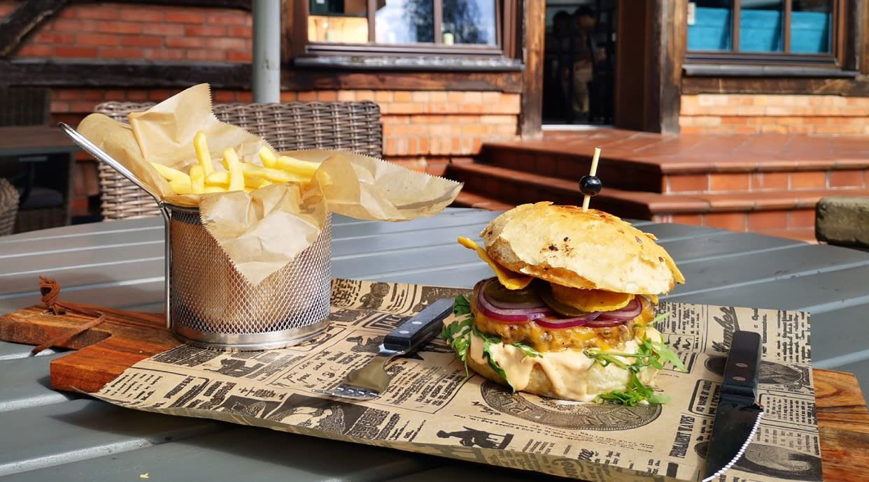 wołowina, sałata lodowa, sos francuski, cebula, ogórek, pomidor, ser wędzony