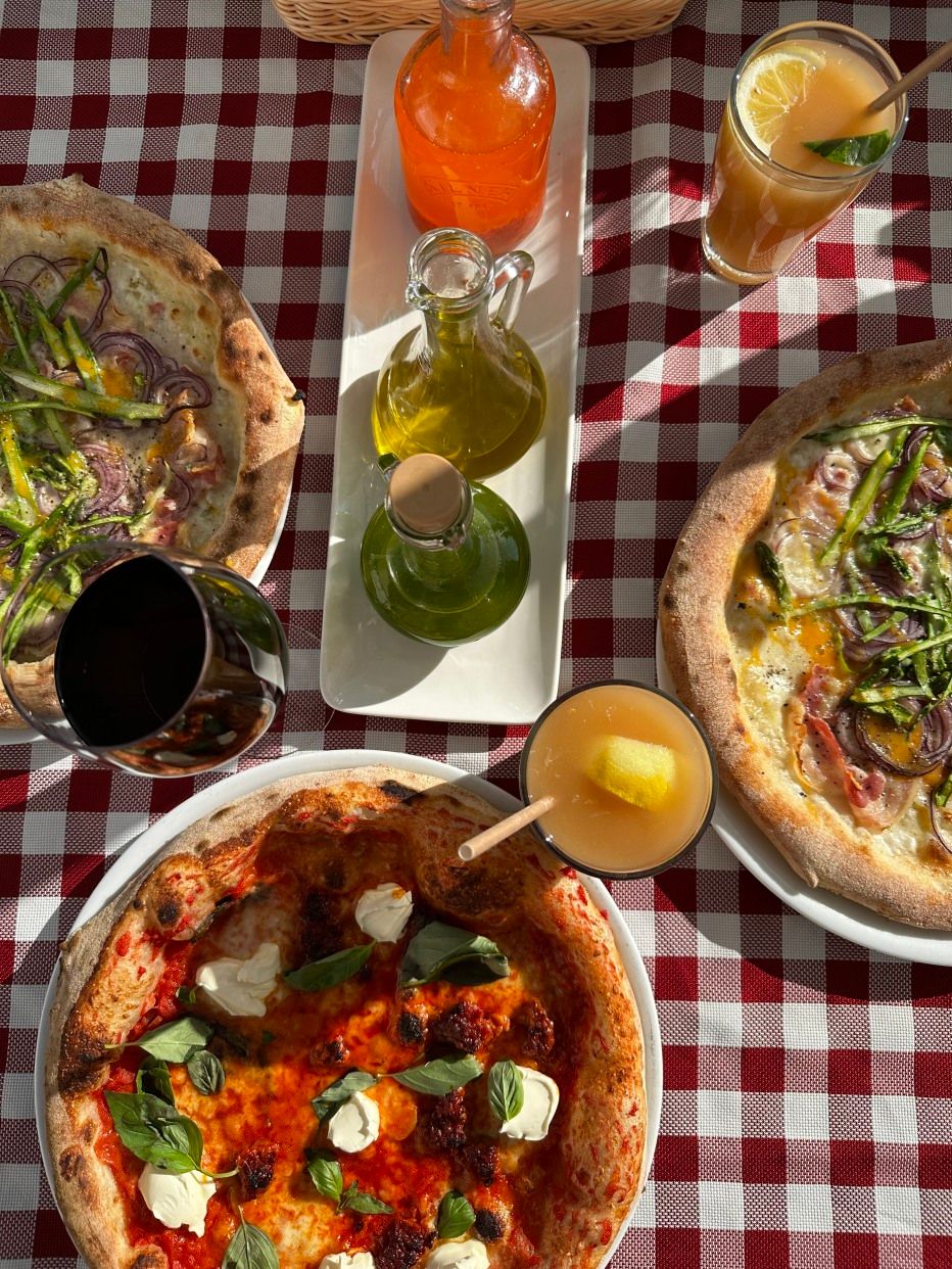 sos pomidorowy, parmezan, mozzarella fior di latte, bazylia, czarne oliwki, pomidorki cherry, nasze pesto bazyliowe, oliwa pietruszkowo-czosnkowa