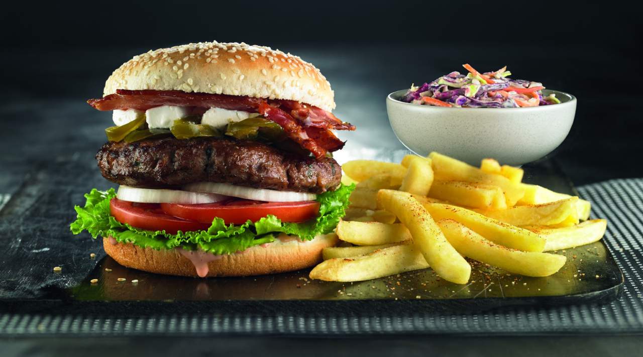 Bułka brioche, 180g wołowiny, ser gouda, boczek, ostre papryczki papperoni, pikantny sos, sałata, ogórek konserwowy, pomidor, cebula, frytki 100g