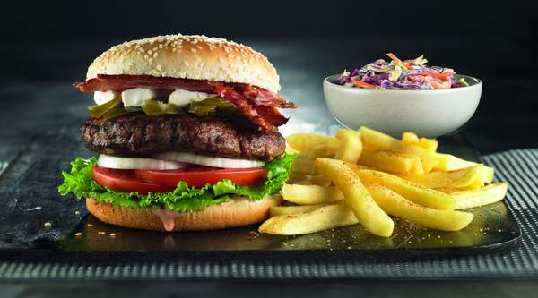 Bułka brioche, 540g wołowiny, 3x ser gouda, 3x boczek, sos tysiąca wysp, sałata, ogórek konserwowy, pomidor, cebula, frytki 100g
