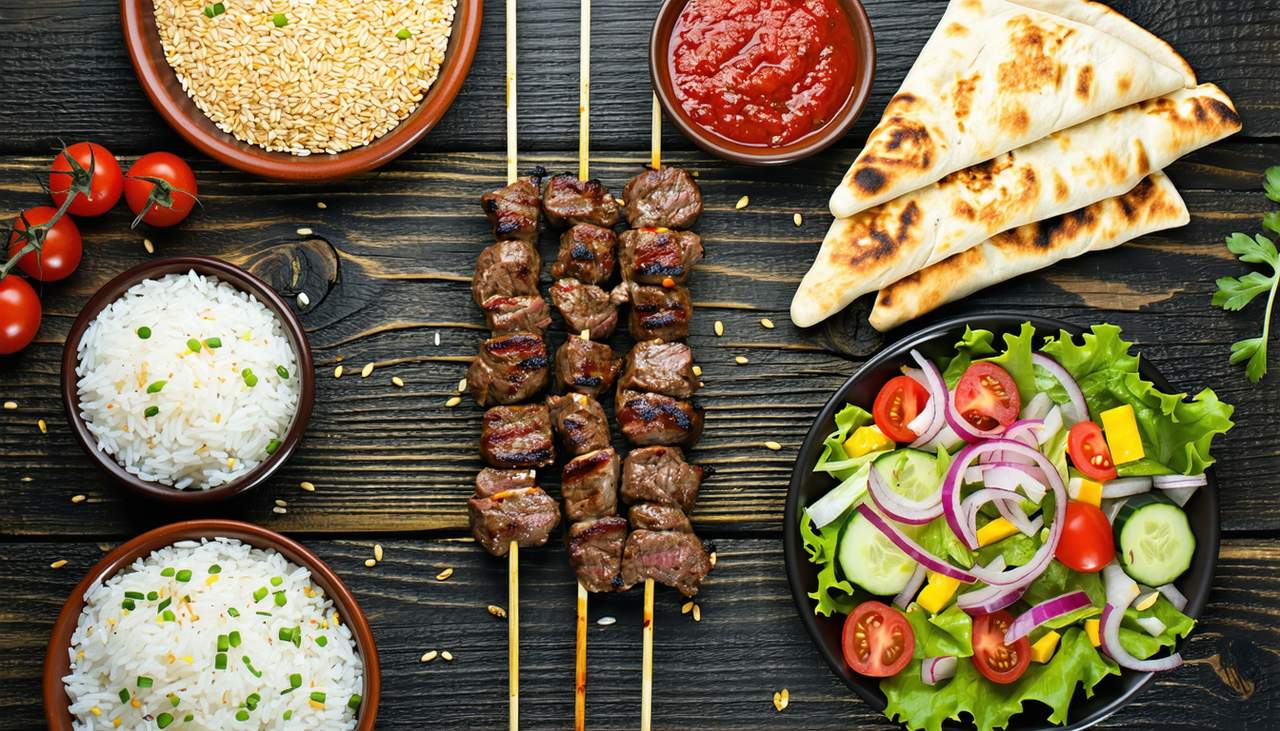 Pieczone mięso wołowina, kurczak lub mieszane mięso, frytki, cienki chleb, surówki, sos *zdjęcie poglądowe