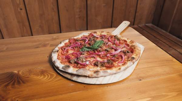 Sos pomidorowy, mozzarella, pieczarki, papryka, czerwona cebula, jalapeno, tabasco