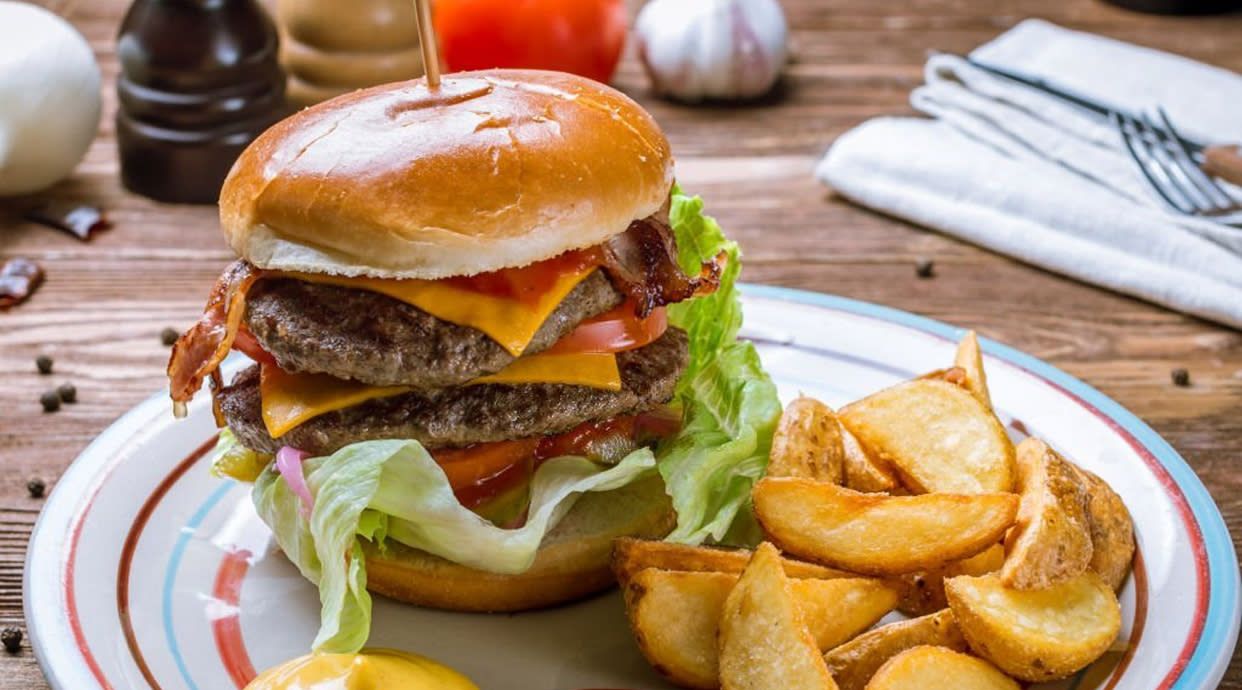 Hambúrguer individual com pão, hambúrguer de novilho, queijo cheddar, cebola roxa, bacon, tomate e alface iceberg acompanhado de batata frita