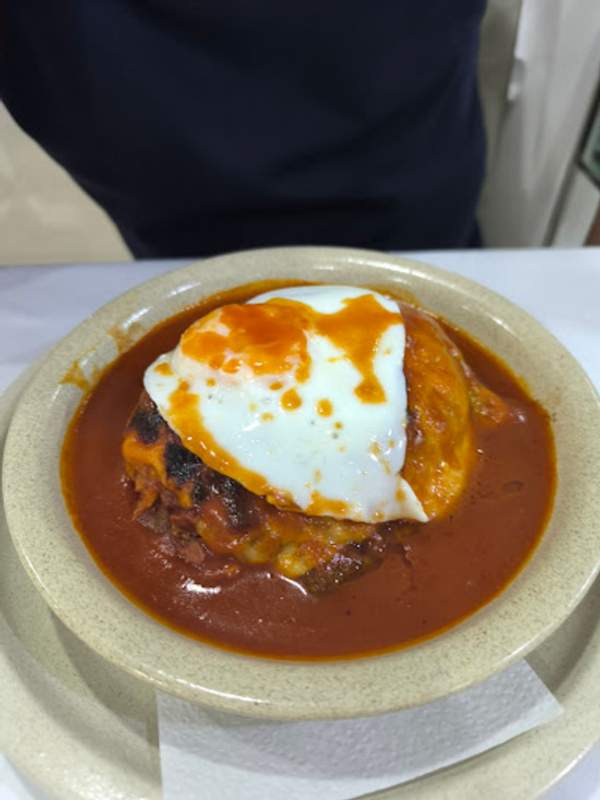 Acompanhado de batata pala, presunto e ovo estrelado.