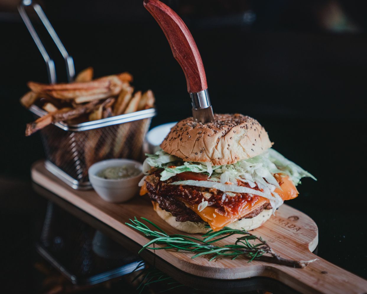 Pão Brioche, dois discos de 100g de carne bovina grelhada à perfeição, bacon grelhado, queijo cheddar, cebola crocante, ovo frito, molho ketchup e maionese de bacon.