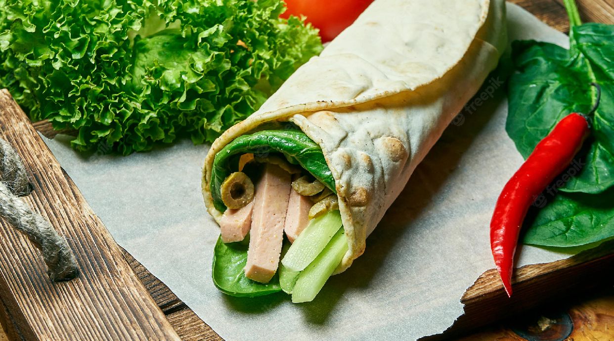 Tortilha Com Carne de Kebab, Alface, Cebola Roxa, Tomate, Cenoura, Milho é Molho.