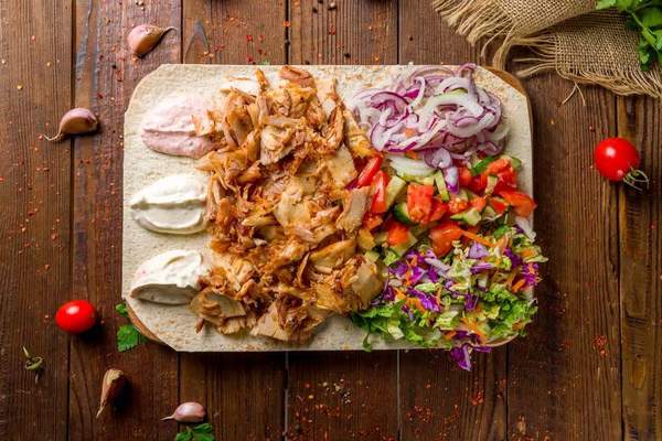 Lipie, carne pui, cartofi prajiti, rosii, salata verde varza, castraveti murati, ceapa, usturoi, maioneza, ketchup, sos curry, sos picant, tzatziki