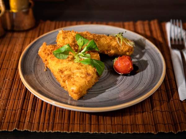 Rántott sajt vegyes körettel/Caşcaval pane cu garnitură mixtă
