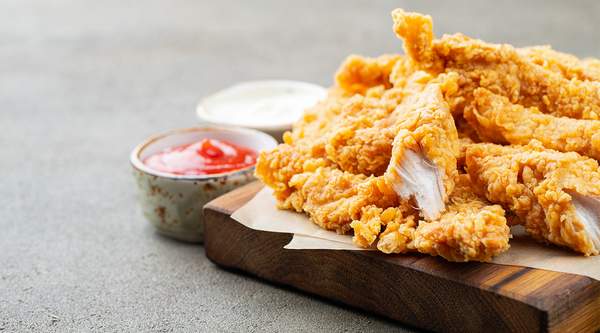 Meniu mare cu crispy de pui, cartofi prăjiți și sos de usturoi. Porția conține crispy de pui, cartofi prăjiți, sos de usturoi, ceapă crocantă și pătrunjel. - 500g