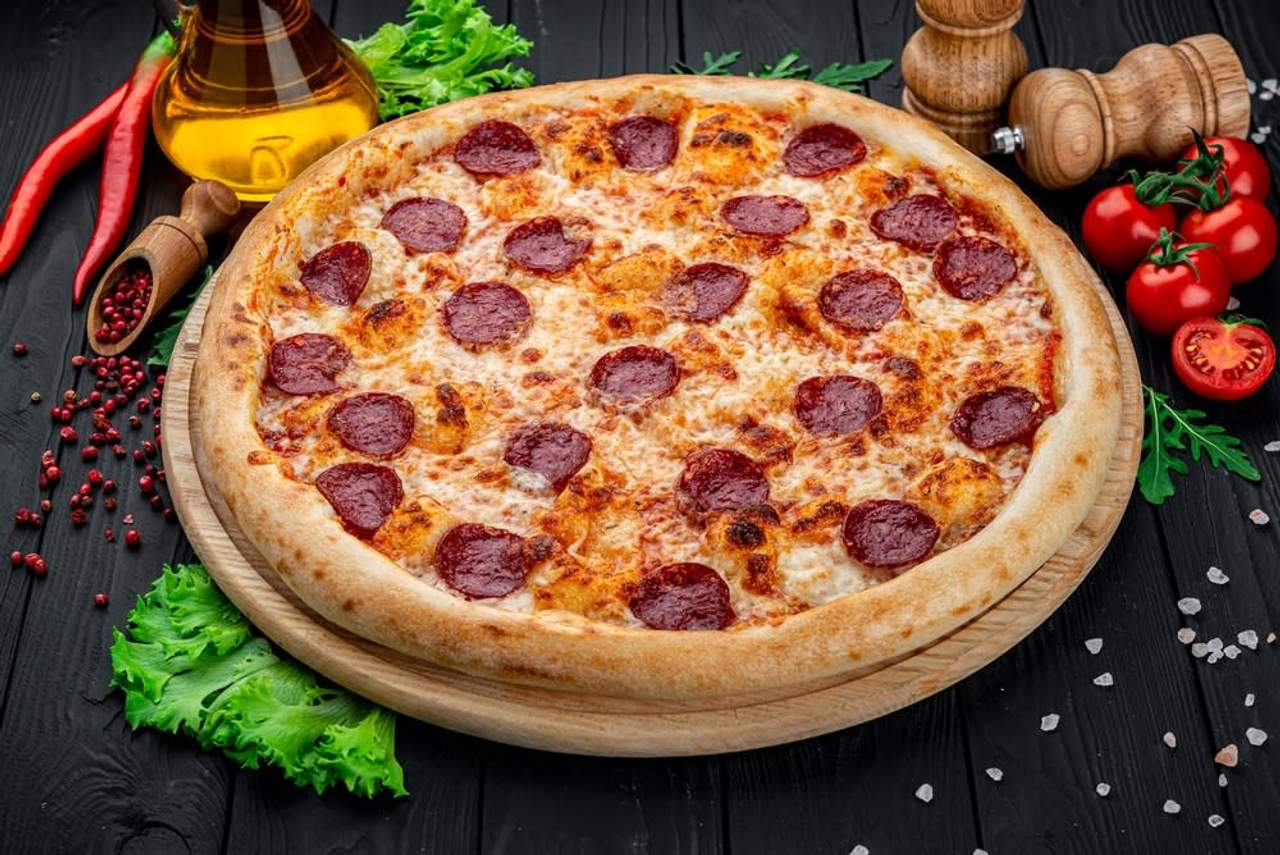Blat de pizza, sos de roşii, mozzarella, kaizer, salam, ardei gras, măsline - 600g