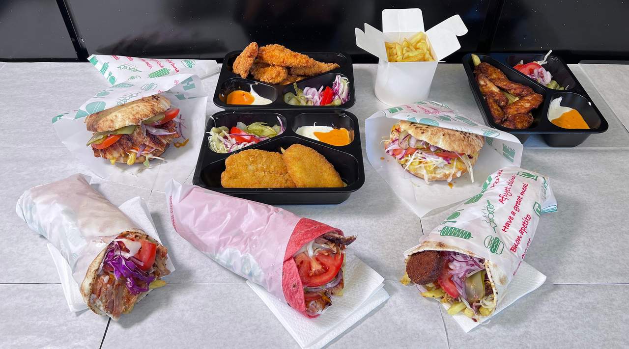 Lipie, falafel, cartofi, rosii, castraveti murati, ceapa, varza, ardei iute, sos maioneza cu usturoi, sos ketchup, sos tzatziki, sos sambal, sos doner, sos Antep, sos Tartar - 600g