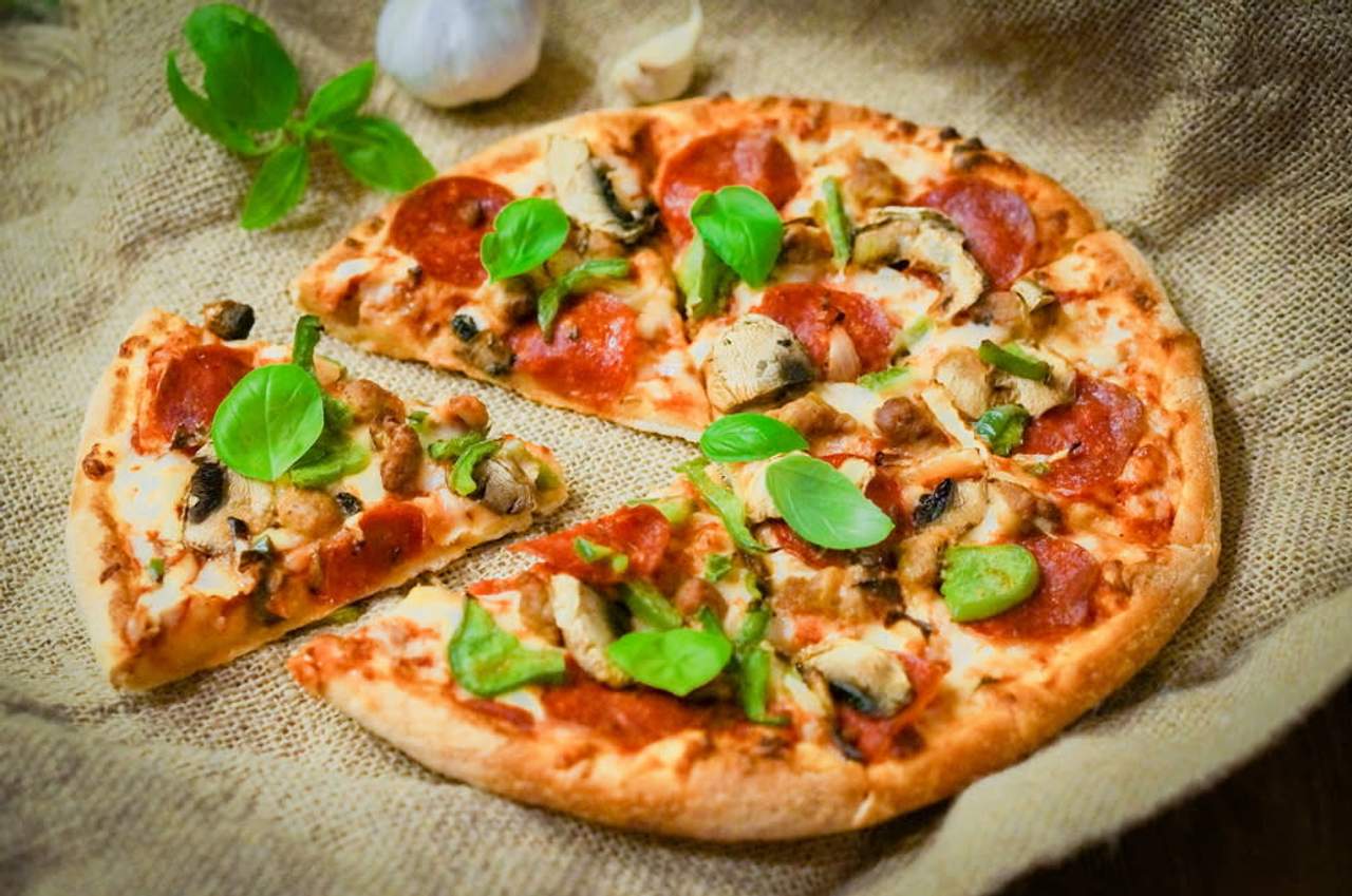 Blat de pizza intins manual copt la foc pe lemne, acoperit cu un sos fin de rosii aromat cu ierburi, ulei de masline, branza mozzarella, ciuperci, sunculita afumata, ardei si rondele de masline.