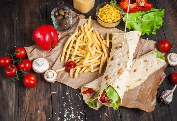 Pileće meso, dve tortilje, pomfrit 200 grama, salata po izboru