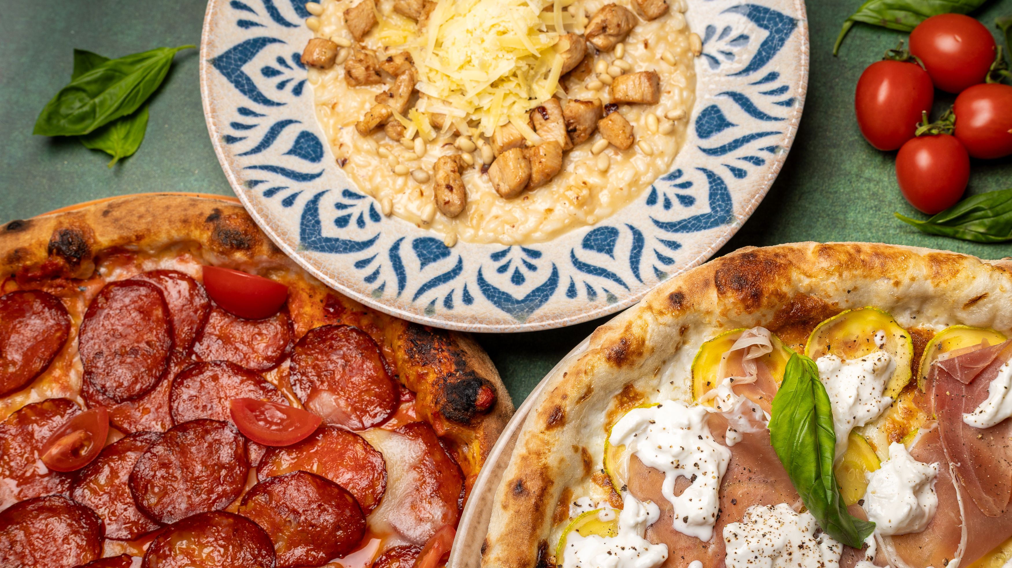 paradajz sos, mocarela fior di latte, rukola, čeri paradajz, grana padano sir, maslinovo ulje