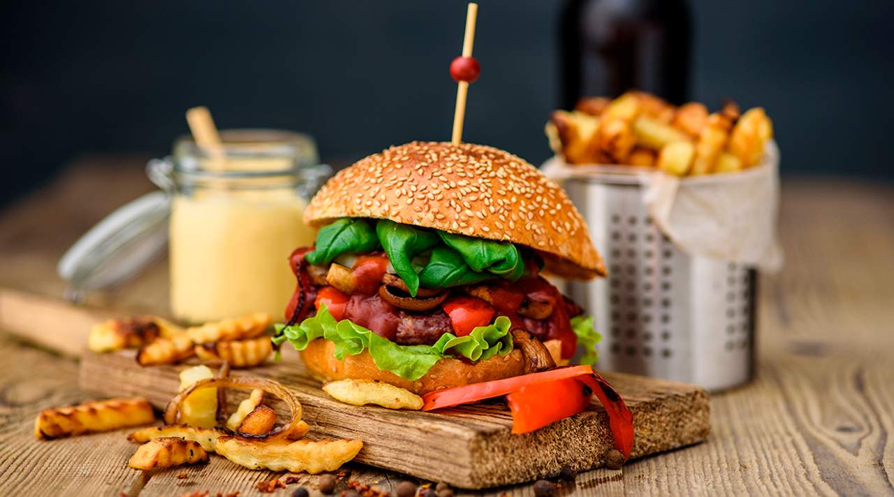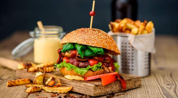 Burger lepinja, juneće meso, cheddar, pančeta, jaje, karamelizovani luk, paradajz, zelena salata, kiseli krastavčići, burger sos, pomfrit