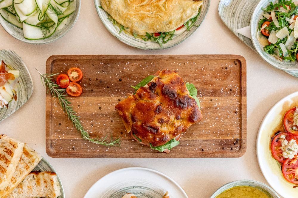 Sendvič spremljen u focacci, lagana kombinacija cotto šunke, sveže rukole, baby spanaća, mozzarelle i stracciatella namaza.