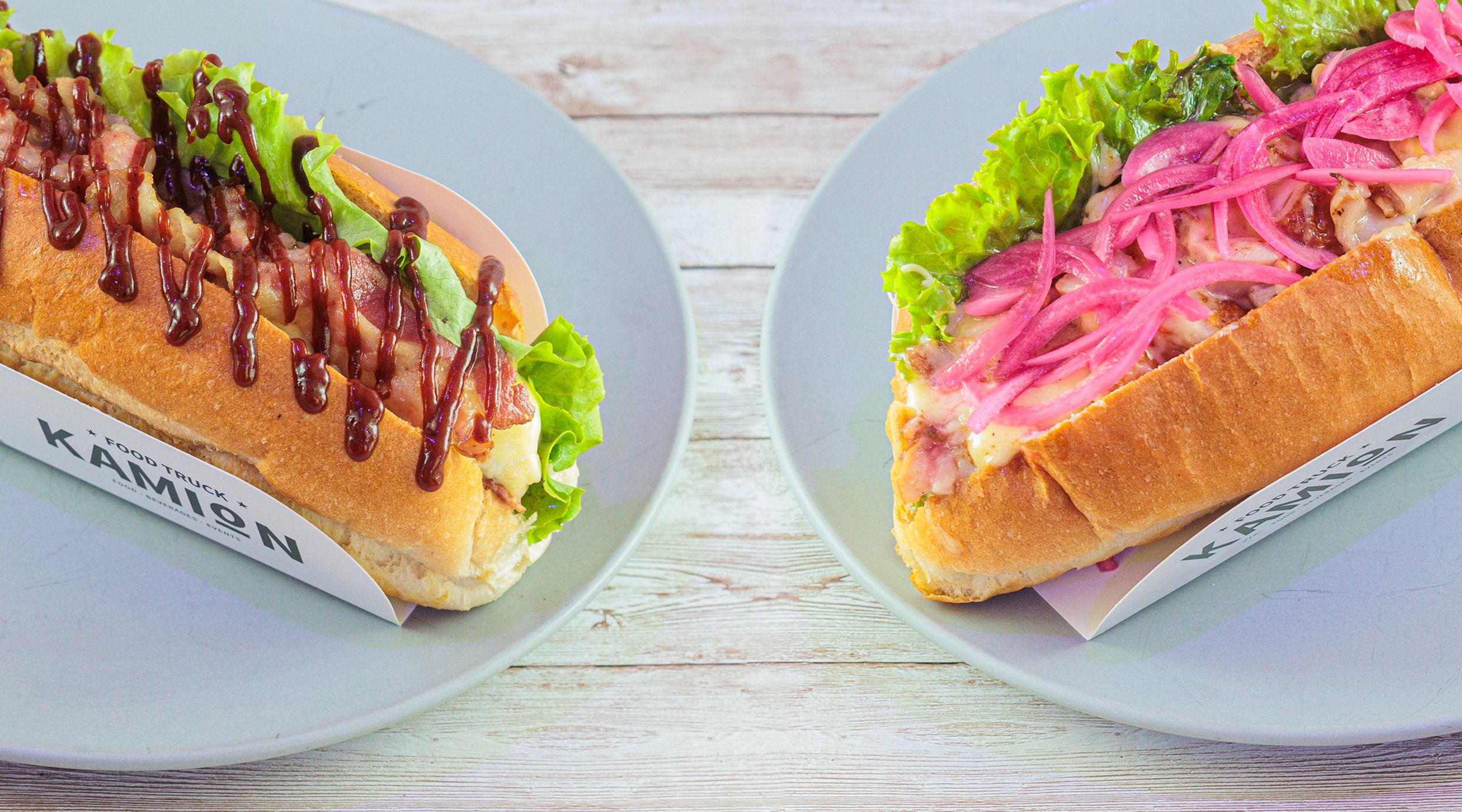 Dimljeni batak, topljeni sir, šampinjoni, feta cream, Kamion sos, zelena salata, kiseli crveni luk