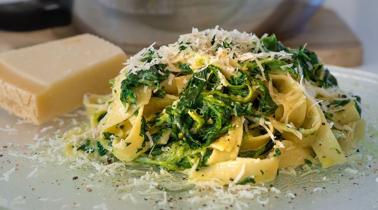 Pileći batak, dimljeni sir, pire od graška, tagliatelle, cherry paradajz, iceberg salata, lepinja